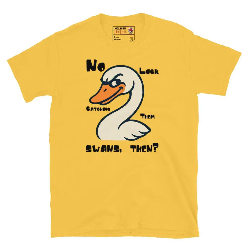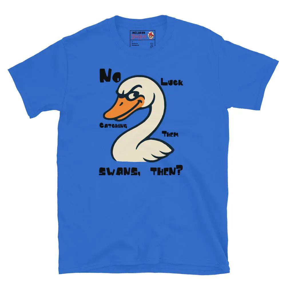 Celebrate one of the most iconic and hilariously random moments in British comedy with our "No Luck Catching Them Swans, Then?" T-shirt — a perfect nod to the cult classic Hot Fuzz. Featuring a bold, cartoon-style swan with a mischievous grin, this tee pays homage to that unforgettable line from the bumbling village local. Whether you're a die-hard Edgar Wright fan or just love quirky British humor, this shirt is a conversation starter and a must-have for your collection.
