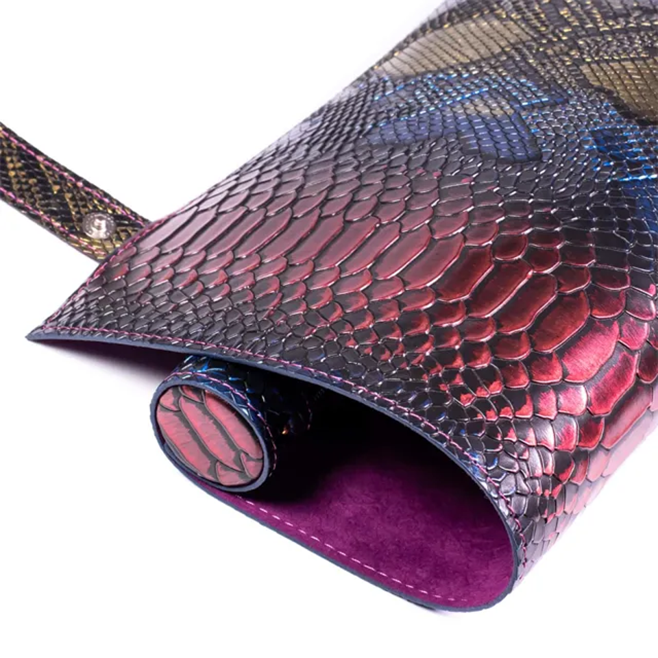 Step into a world where every roll counts with the Scroll of Legends, a strikingly designed dice mat/case crafted from vegan leather. Perfect for the discerning Dungeons and Dragons (DnD) player, this scroll features an exterior of multicoloured dragon scales and an interior dice mat of plush purple velvet, combining luxury with legendary aesthetics.