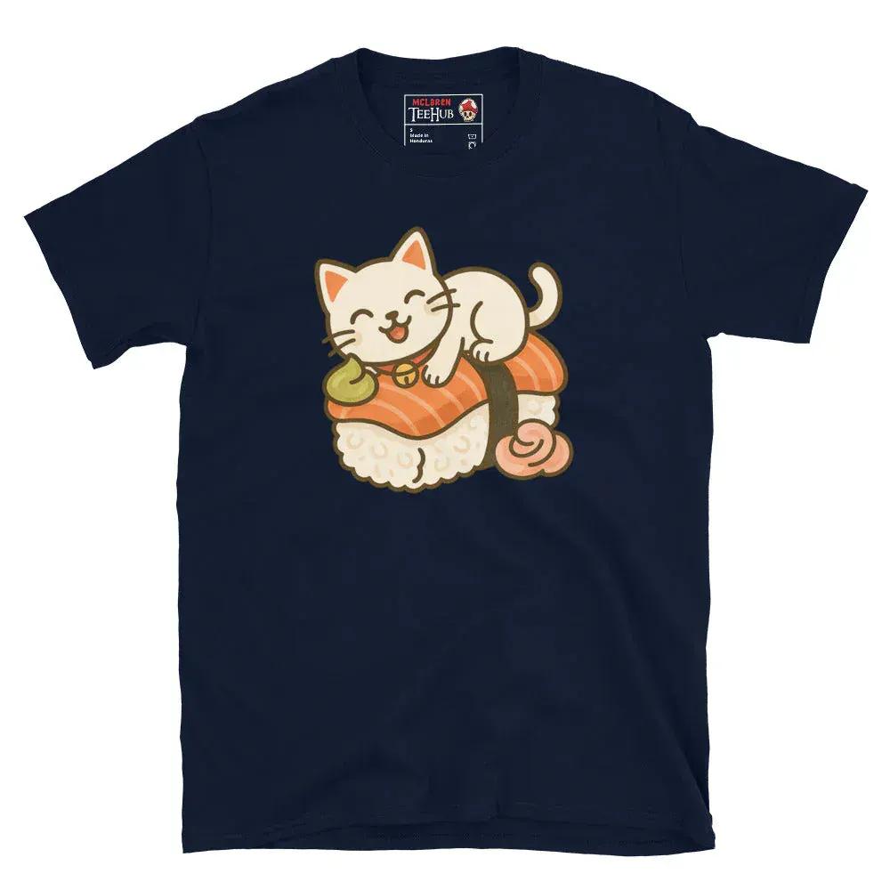 Bring a smile to your day with our Sushi Cat T-Shirt, exclusively from McLaren Tee Hub. This adorable tee showcases a cute, kawaii-style cat lounging on a delicious piece of salmon nigiri sushi, complete with a dollop of wasabi and a seaweed wrap. Perfect for sushi lovers, cat enthusiasts, and fans of all things cute and quirky, this T-shirt is made from premium cotton, ensuring a comfy fit and long-lasting wear.