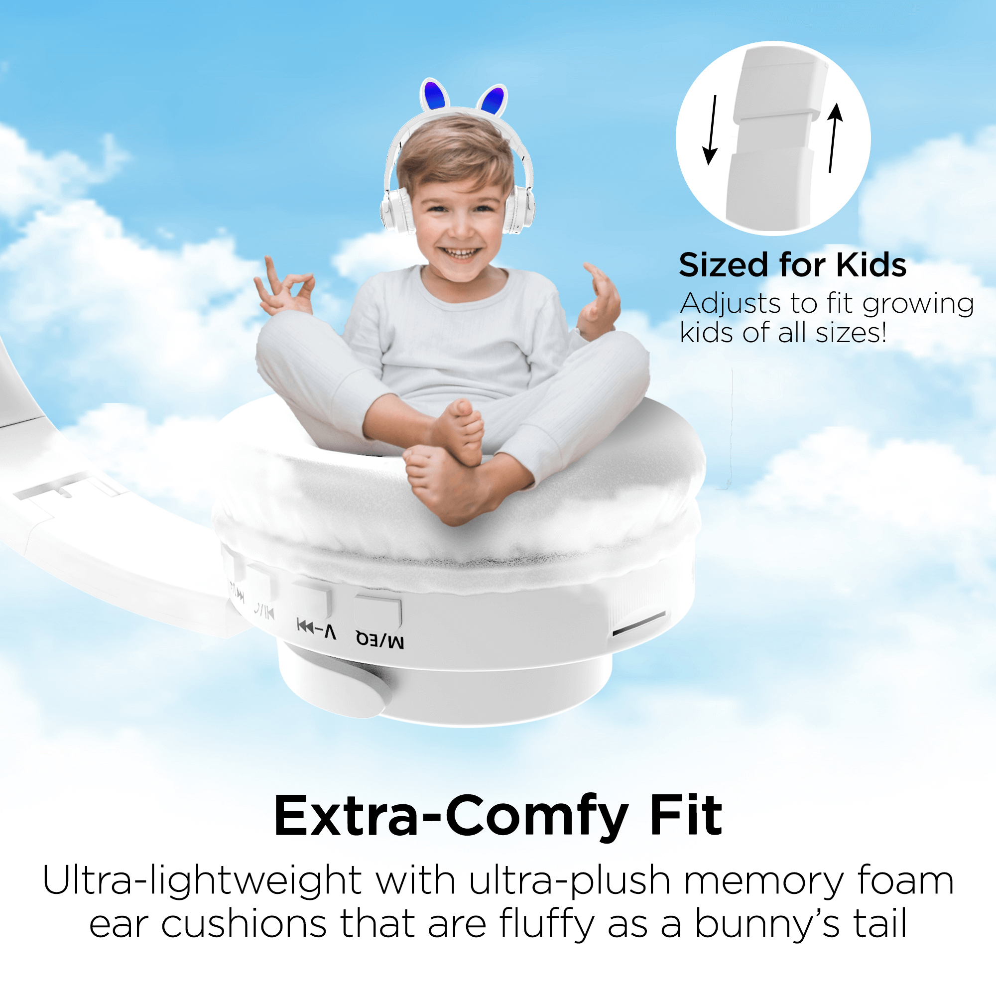 Introducing Bunny Tracks, the ultimate wireless headphones made just for little ears! FUN FACT: A group of bunnies is called a *fluffle* — and these headphones pack a fluffle of features to keep your kiddo entertained during music time, TV watching, gaming, and online learning. Soft as a bunny’s tail, the ultra-plush ear cushions, adjustable padded headband, and lightweight yet sturdy frame ensure all-day fluffy comfort.